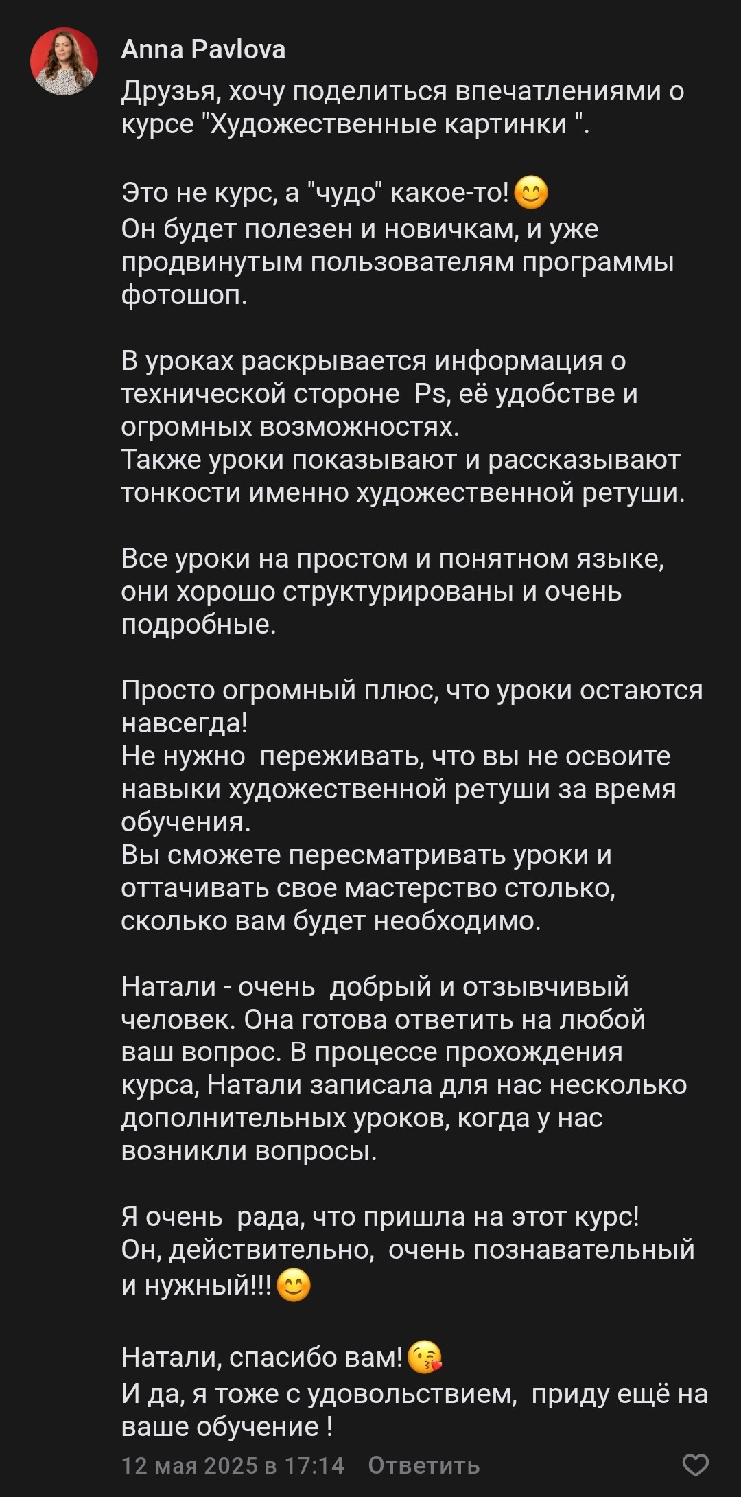 На протяжении всего обучения я постоянно вас поддерживаю: даю обратную связь по домашним работам, отвечаю на вопросы и разбираю ошибки. Вы не остаётесь один на один с материалом — я рядом и помогаю в сложных моментах.